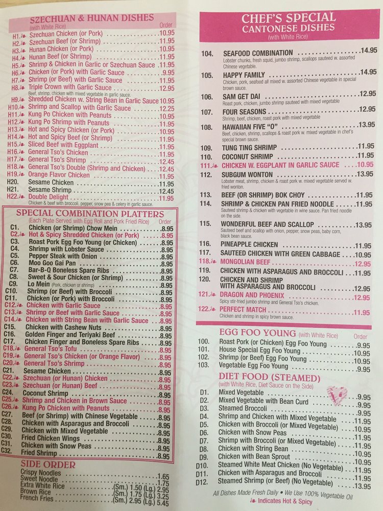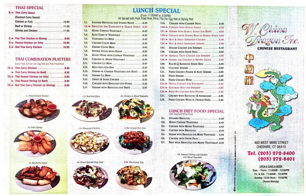 China Dragon in Cheshire, CT, is a Chinese restaurant known for its impeccable execution of traditional dishes. With a menu offering a variety of appetizers like Egg Rolls and Shrimp Rolls, along with classic soups like Wonton Soup and Egg Drop Soup, China Dragon caters to both meat lovers and vegetarians. The Fried Rice options range from Plain Fried Rice to a flavorful Egg Fried Rice. Customers rave about the perfectly seasoned dishes, friendly staff, and efficient service. The General Tso's Chicken, General Tso Tofu, and combo meals are highlighted for their delicious flavors and generous portions. The restaurant offers a casual dining experience with options for takeout, delivery, and catering. China Dragon stands out for its consistently excellent Chinese cuisine and welcoming atmosphere, making it a go-to spot for authentic and satisfying meals.